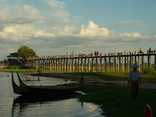 A teak-wood bridge that stretches to the horizon---longest in the world---where monks congregate in the evening to watch the moon rise.